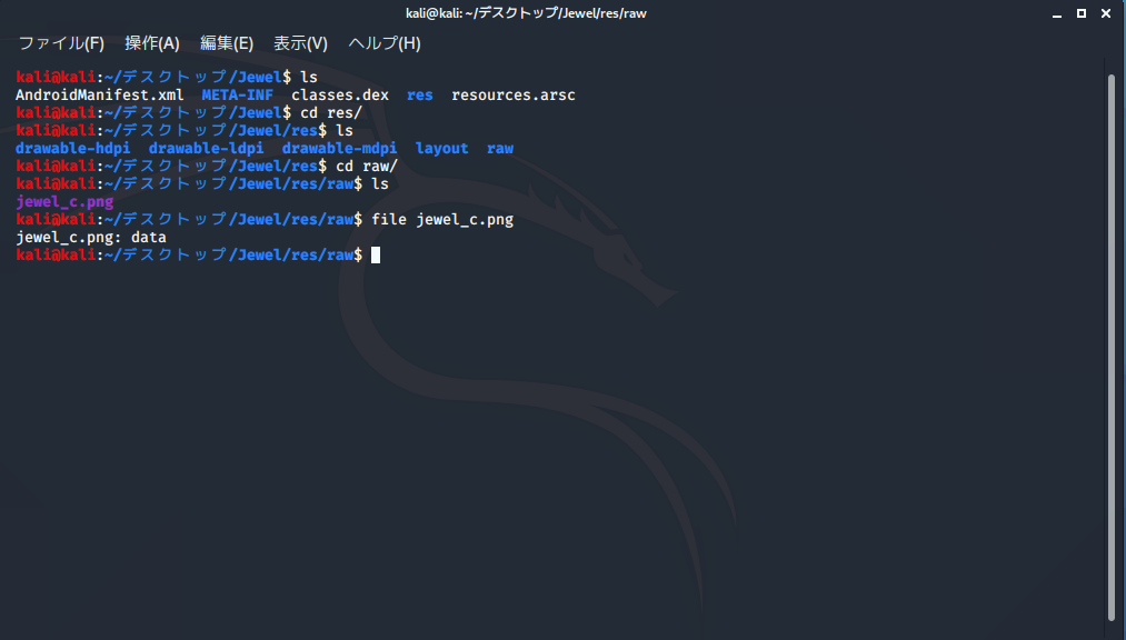 暗号化するデータは最初に見つけた怪しい画像(jewel_c.png)になる。直感的にこのファイルを暗号化するんだろうなということが分かると思うが、ちゃんとリソースID(0x7f040000)を確認したい場合はAPKファイルをAndroid Studio等で開くと確認できる。