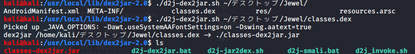 その後、dex2jarを使用してclass.dexをjarファイルに変換する。