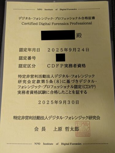 タイトルの通り、デジタル・フォレンジック研究会のDF実務者資格(CDFP-P)を取得しました!! 7割以上の得点で一発合格 合格体験記はほかの方も書いていますが、自分も感想等を少し書きたいと思います。 DF実務者資格(CDFP-P)とは?(ざっくり) 国内のデ…